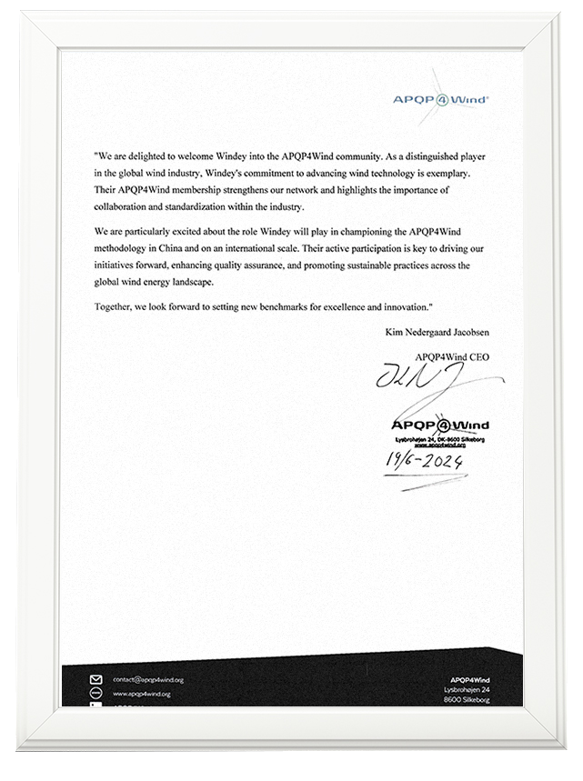 "Windey is a global leader in the wind energy industry, and its investment in promoting the development of wind energy technology is exemplary. The addition of Windey to the APQP4Wind family has injected new strength, highlighting the importance of collaboration and standardization in the industry. Their active participation is crucial to promoting the development of APQP4Wind, strengthening quality assurance, and promoting sustainable practices in the global wind energy sector." Kim Nedergaard Jacobsen, CEO of APQP4Wind Association, sent sincere greetings and looked forward to working with Windey to "set a new benchmark for excellence and innovation together!"