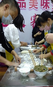 捏餃子比賽也在緊張激烈的進(jìn)行著,她揉面,你搟皮,我裝餡忙而不亂,女神、男神一起動手。